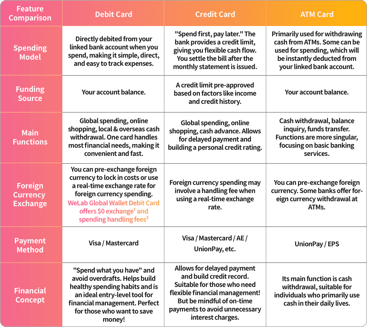 Before we dive into a deep comparison, let's first get a clear understanding of what a "debit card" is! Simply put, it's a card that is directly linked to your personal bank account, just like WeLab Global Wallet Debit Card 💰️.