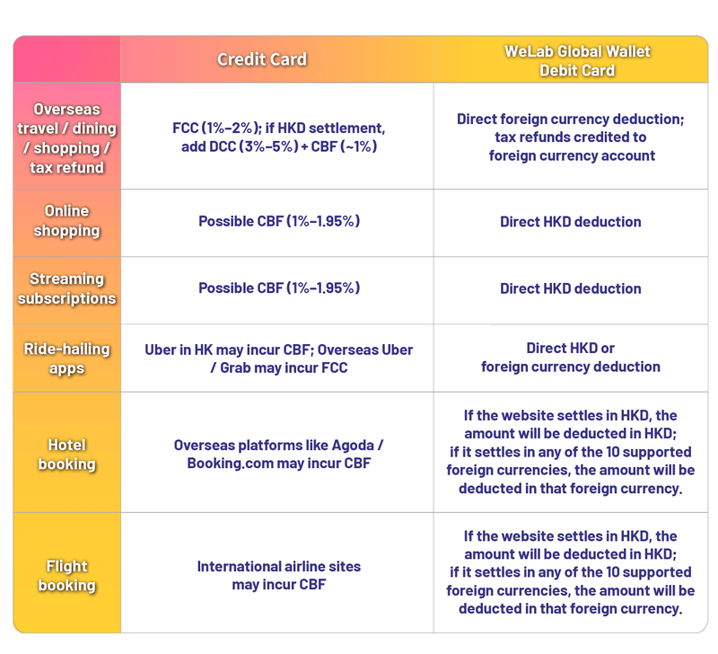 Want to stop paying extra? Choose a 0-fee payment tool! With WeLab Global Wallet Debit Card, enjoy HKD 0 transaction fees on 11 major currencies spending¹, direct foreign currency settlement, and hassle-free travel without carrying cash. Perfect for shopping, subscriptions, and everyday spending!