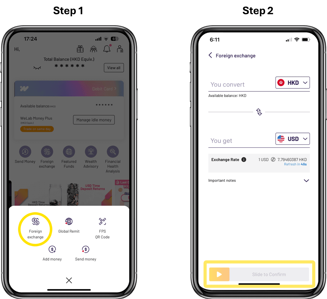 Want to exchange USD using WeLab Bank? It’s as easy as two simple steps—no queues, no fees, and you get WeLab Bank’s best rates, helping you save both money and time!