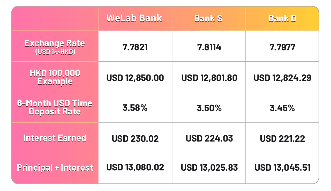 (1) The example uses exchange rates and time deposit interest rates announced by Bank S, Bank D, and WeLab Bank at 2:14 PM on September 15, 2025, rounded to four decimal places for easier comparison. Actual exchange rates and annual deposit interest rates may vary due to market fluctuations. Please refer to the rates shown in the WeLab Bank App on the day of transaction for the most accurate information.