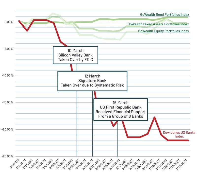 We understand that the recent chain reaction of US and European banks has caused concerns among investors. However, this is exactly the reason why our Bank has designed GoWealth: We hope to help investor to capture opportunities despite volatile market conditions by investing in portfolios with ability to diversification of risks1. And from the recent performance in March, you will be able to see how GoWealth can help you diversify risks1.