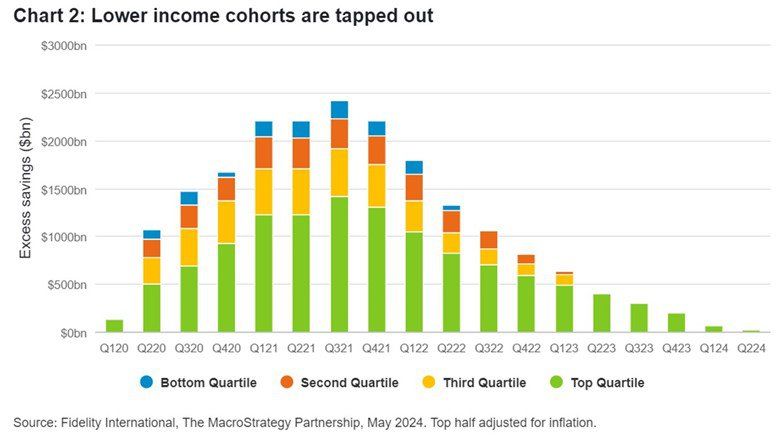 That slowdown in demand looks to us to be a question of ‘when’ not ‘if’. There is a shrinking portion of Americans who are able to keep spending in the way they’ve been doing since the pandemic. The stress of consumers at the lower end is well known, but those on middle-incomes are seeing real income growth at just 25 per cent of 2023 levels, as well as depleted excess savings and ongoing cost of living pressures.