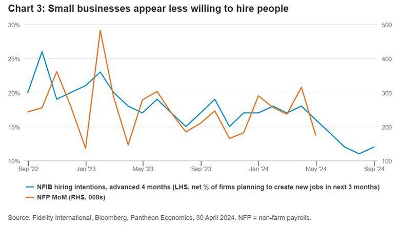 Although most recent employment data has surprised to the upside, leading indicators of employment growth now point to a slowdown. These include the National Federation of Independent Business (NFIB) small business survey of employment intentions which, barring a recent small uptick, has been in a downtrend going back more than six months, as well as the quits rate (those who have chosen to leave their job).