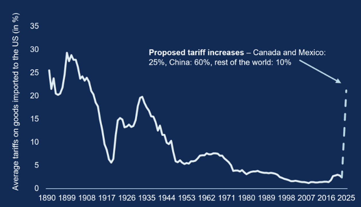 Source: Allianz Global Investors Global Economics & Strategy, Bloomberg, United States International Trade Commission (data as at 27 November 2024). Note: chart assumes tariff rates will rise from current levels to those indicated by Mr Trump.