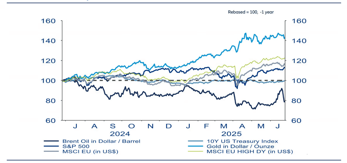 In June this year, Israel’s attack on Iran resulted in a further surge in gold and oil prices. This demonstrates how quickly markets react to political headlines. The MSCI Europe as well as the S&P500 Index oscillated between brief recoveries and abrupt setbacks over the year, albeit the European index did so with less intensity. This reflects investors’ stance on the current attractiveness of the European market and the relative confidence in the political environment in Europe.