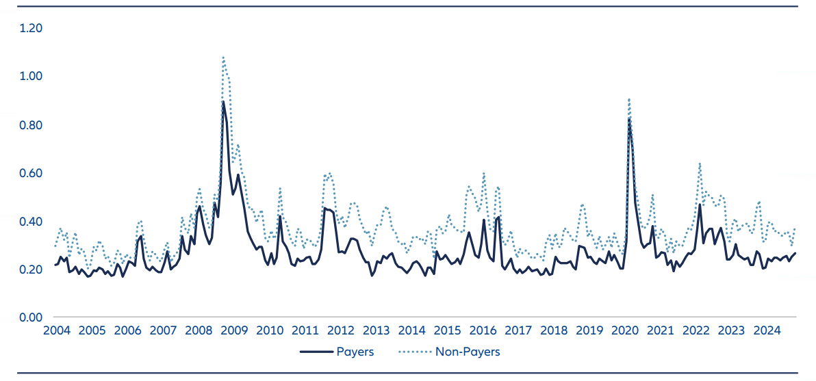 Equally weighted 30-day volatility of dividend payers and non-payers, respectively.