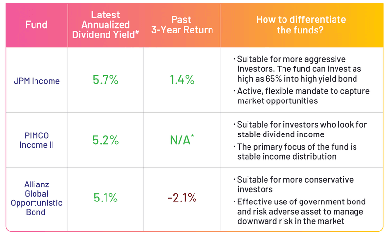 #Data as of 31 May 2023. The table lists out all the funds under such themes and the latest annualised yield, year to date total return and past 3-year return of the funds. The figures are provided by Morningstar Asia Limited and are for information only. We do not take responsibility for and do not endorse the accuracy of such information. Past performance is not indicative of future results. Dividend funds listed above aim to pay dividend on a monthly basis. Dividend payout is not guaranteed and may be paid out of capital. The information set out in the table above is for reference only and does not constitute any comment, recommendation, solicitation, offer or sale of any investment product.