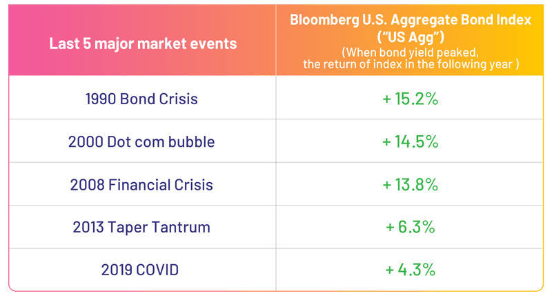 The One-year return of the US Agg of the above market events are calculated from: 1990 Bond Market Crash: 26 April 1990; 2000 Dot Com Bubble: 18 May 2000; 2008 Global Financial Crisis: 31 October 2008; 2013 Taper Tantrum: 5 September 2013; COVID-19: 19 March 2020. The figures are obtained from the reliable sources and are for information only. We do not take responsibility for and do not endorse the accuracy of such information. Past performance is not indicative of future results.