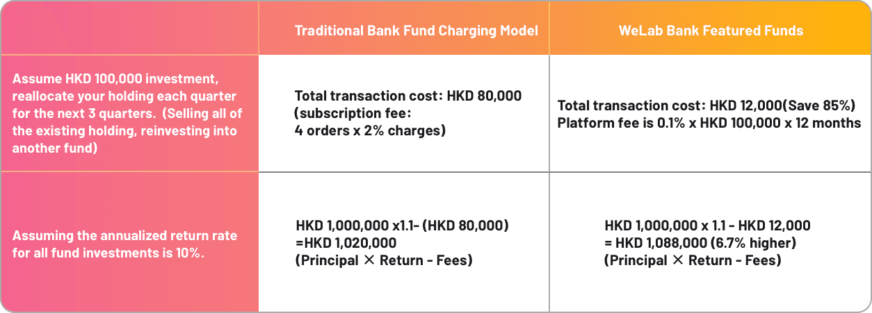 #Assuming the subscription fee rate is 2%, customers who use our Featured Funds Services can save 85% of transaction costs in the above two examples compared with the traditional charging model charging with subscription fee. The examples above are for illustration purposes only. Before making any investment decisions, you should consider your own financial situation, investment objectives and experiences, risk acceptance and ability to understand the nature and risks of the relevant product(s).