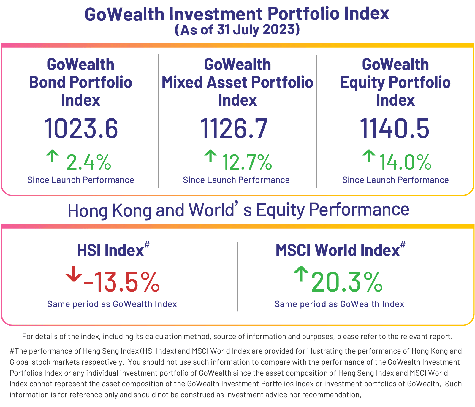 Note: We formulate GoWealth Investment Portfolio Index for bond portfolios, mixed asset portfolios, and equity portfolios respectively, aiming at illustrating the performance of the investment portfolios of GoWealth since launch. The Index is provided for reference only and does not constitute any offer, solicitation, recommendation, comment or any guarantee to the purchase or sale of any investment products or services. Investment involves risks. Past performance is not indicative or guarantee of future results. You should not regard the index as a prediction or guarantee of future performance.