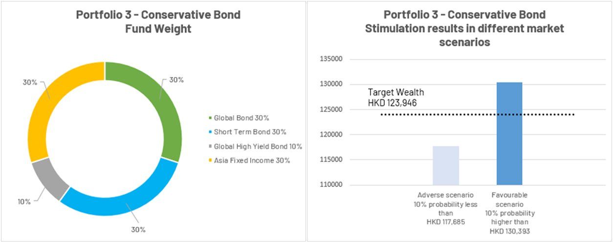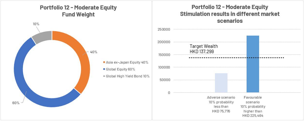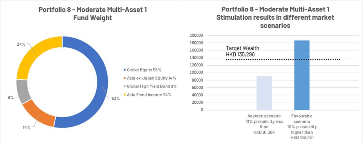 *The above charts illustrate the performance of the portfolio recommendation under adverse and favorable scenarios as well as the target wealth for reference only. The portfolio recommendation of WeLab Bank GoWealth Digital Wealth Advisory considers your latest inputs and personal circumstances specific to the goal. Your risk appetite, risk capacity, goal-specific investment objective and investment horizon, investment product knowledge and experience, and your financial situation will also be assessed upon order placement. However, the recommendation is not a guarantee of future result nor guarantee that you will achieve your goal. Before investing, you should carefully consider your investment objective, risks, charges and expenses and seek independent professional advice if necessary. For details of the portfolio recommendation please refer to the FAQ section of the GoWealth Digital Wealth Advisory Services.