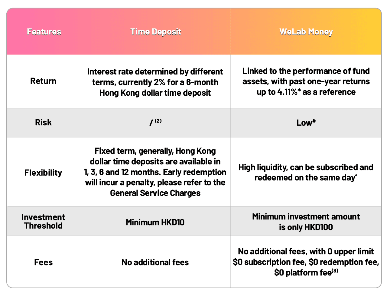 (3) Fund platform fee (0.1% per month) for WeLab Money Plus will be waived, please refer to the Fund details page in WeLab Bank app and General Service Charges.