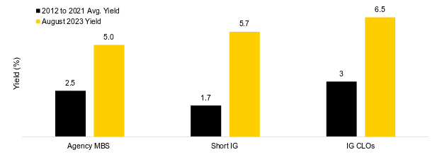 Past performance is not an indication of future results. It is not possible to invest directly in an index. Yields based on yield to worst. For illustration purposes only. Source: Bloomberg as of 31 August 2023. US Investment Grade bonds represented by the Bloomberg US Corporate Bond Index. US CLO represented by the JPM CLO IG Index. Agency MBS represented by Bloomberg US MBS Index.