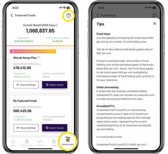 - Added "Unrealized Profit/Loss" data, you can view the "Unrealized Profit/Loss" HKD equivalent amount and percentage of Featured Funds (including WeLab Money Plus) and Digital Wealth Advisory portfolios in your holdings, keeping track of the latest investment performance.