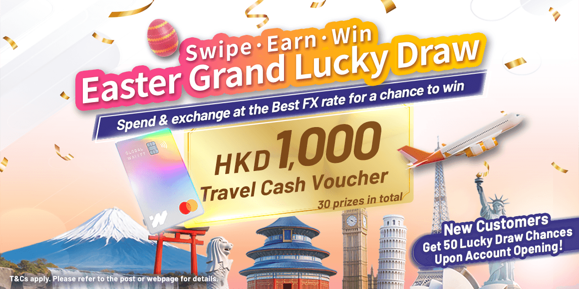 From booking flights to shopping abroad this Easter, exchange foreign currencies at WeLab's Best Rate in town1 at cost price2, and spend with WeLab Global Wallet Debit Card to enjoy $0 foreign currency transaction fees3. Starting from 1 April, earn up to 3% cashback on overseas spending4. Every transaction helps you save more — plus a chance to win HKD 1,000 travel vouchers5 anytime! 🎰