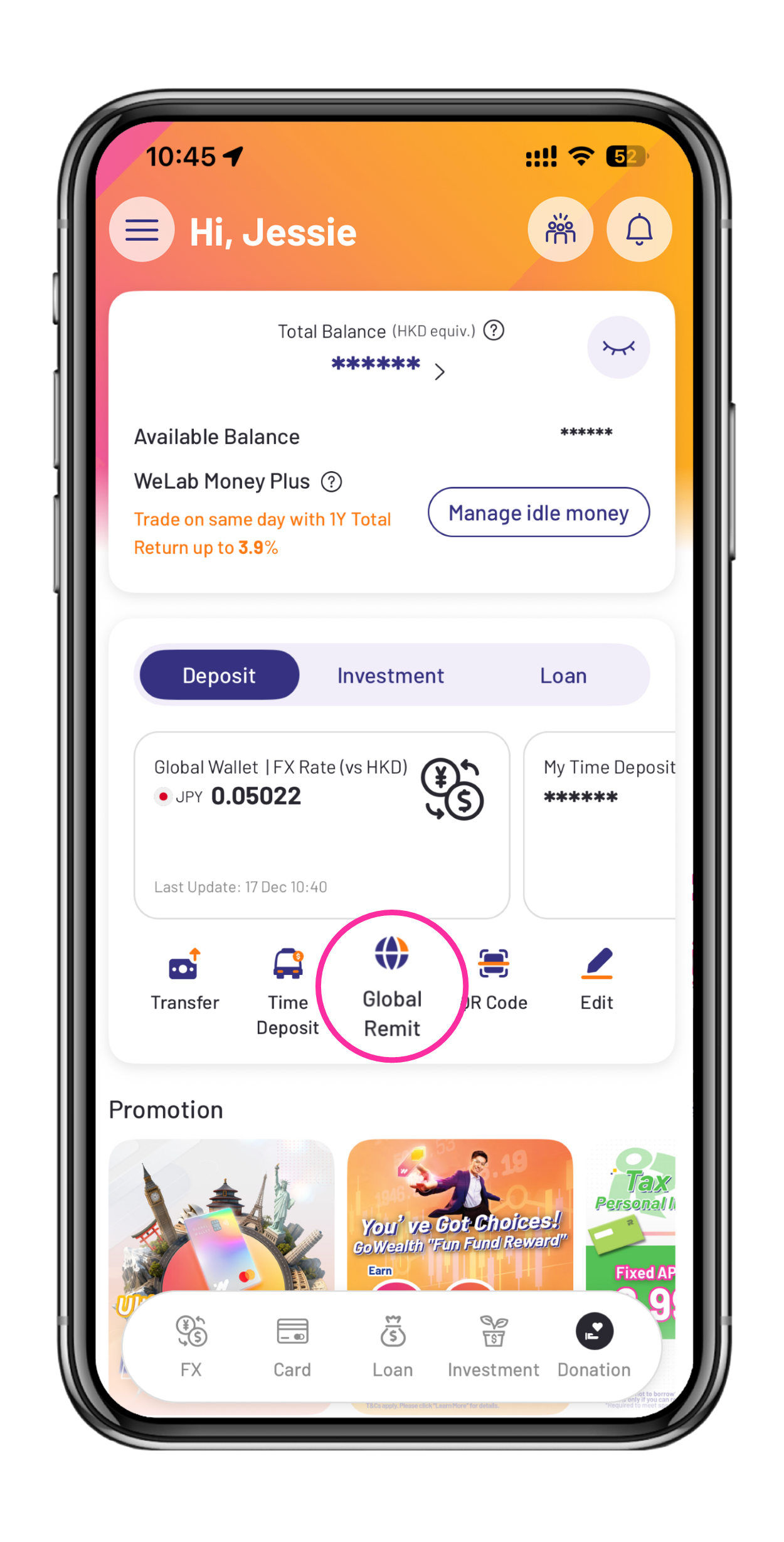 During promotion period, all outward remittance successfully made through the “Global Remit” function in the WeLab Bank App can enjoy WeLab remittance handling fee waivers. The actual fee quote with waiver ($0) will be directly displayed in the WeLab Bank App as an Eligible Customer submits a remittance transaction.