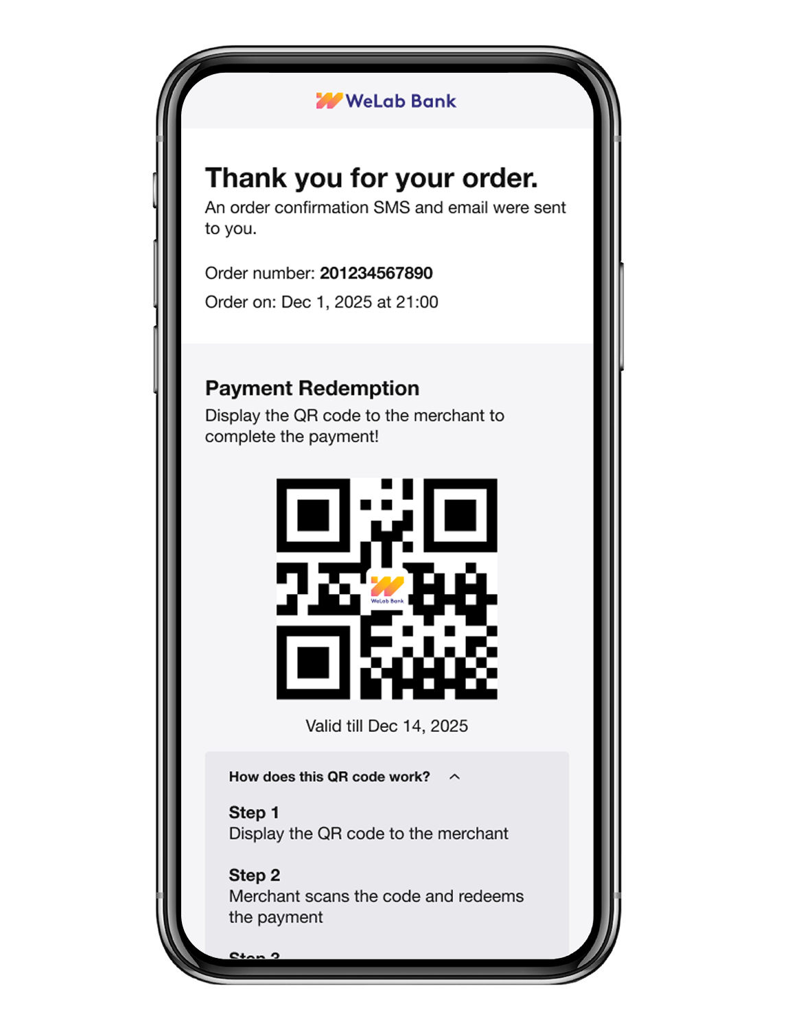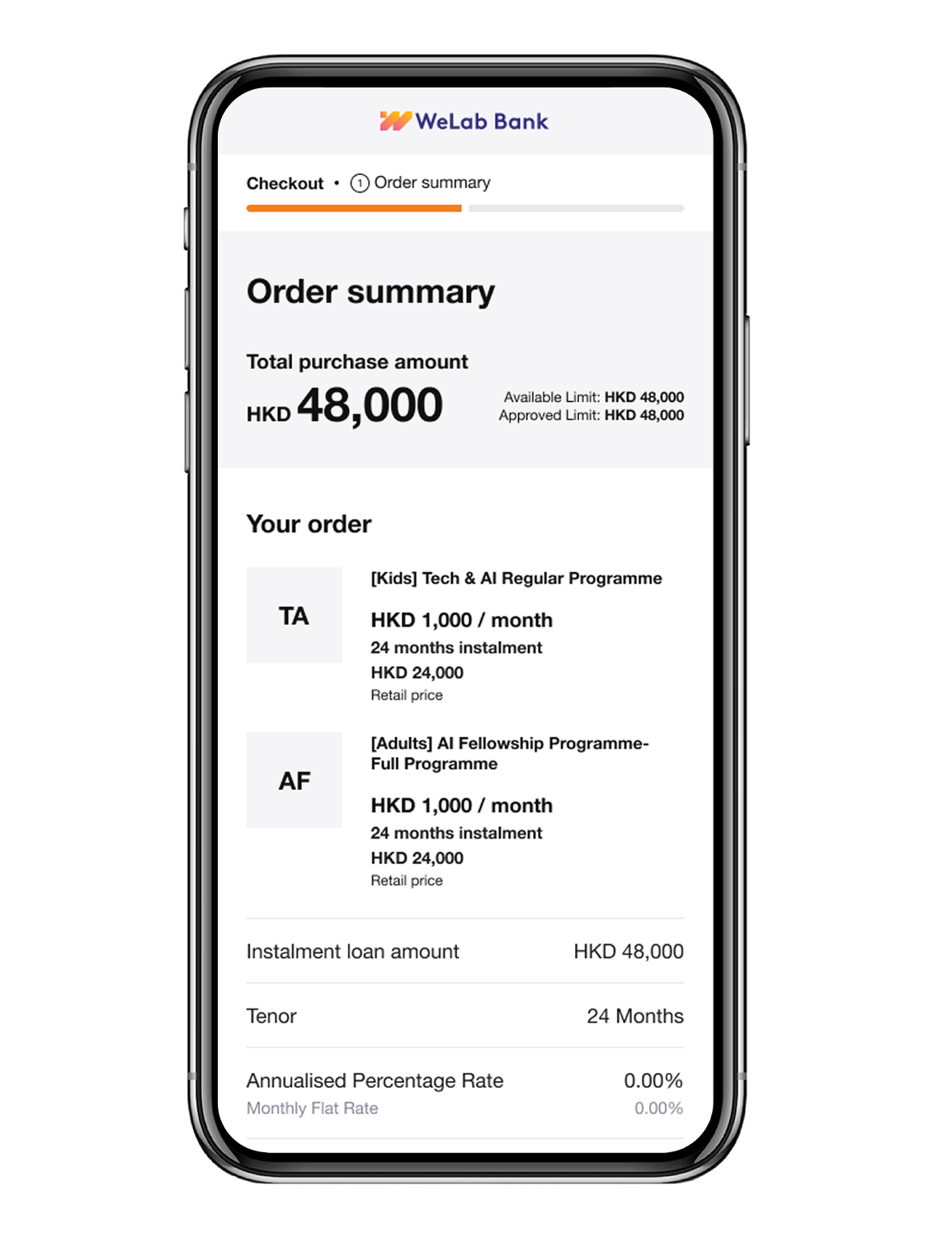 (3) The Annualized Interest Rate (APR) under this program is 0%. The APR is calculated according to the guidelines issued in respect of the Code of Banking Practice and rounded to the nearest 2 decimal places and may vary for individual customers. The APR is a reference rate, which includes all applicable interest rates, fees and charges of the product, expressed as an annualized rate, and the APR and monthly repayment amount applicable to individual customers may vary. The revolving credit limit, APR and the loan tenor of the instalment loan of this program will be subjected to the bank’s final approval. If you do not have a valid WeLab Bank account before the application of this program, you will apply to open a WeLab Bank account during the application of the program. After the completion of the application, please download and log in WeLab Bank app to re-authenticate your account and complete setting up as soon as possible. Your account will not be fully functionable including that you cannot make another purchase with the revolving credit line until you have completed the re-authentication.
