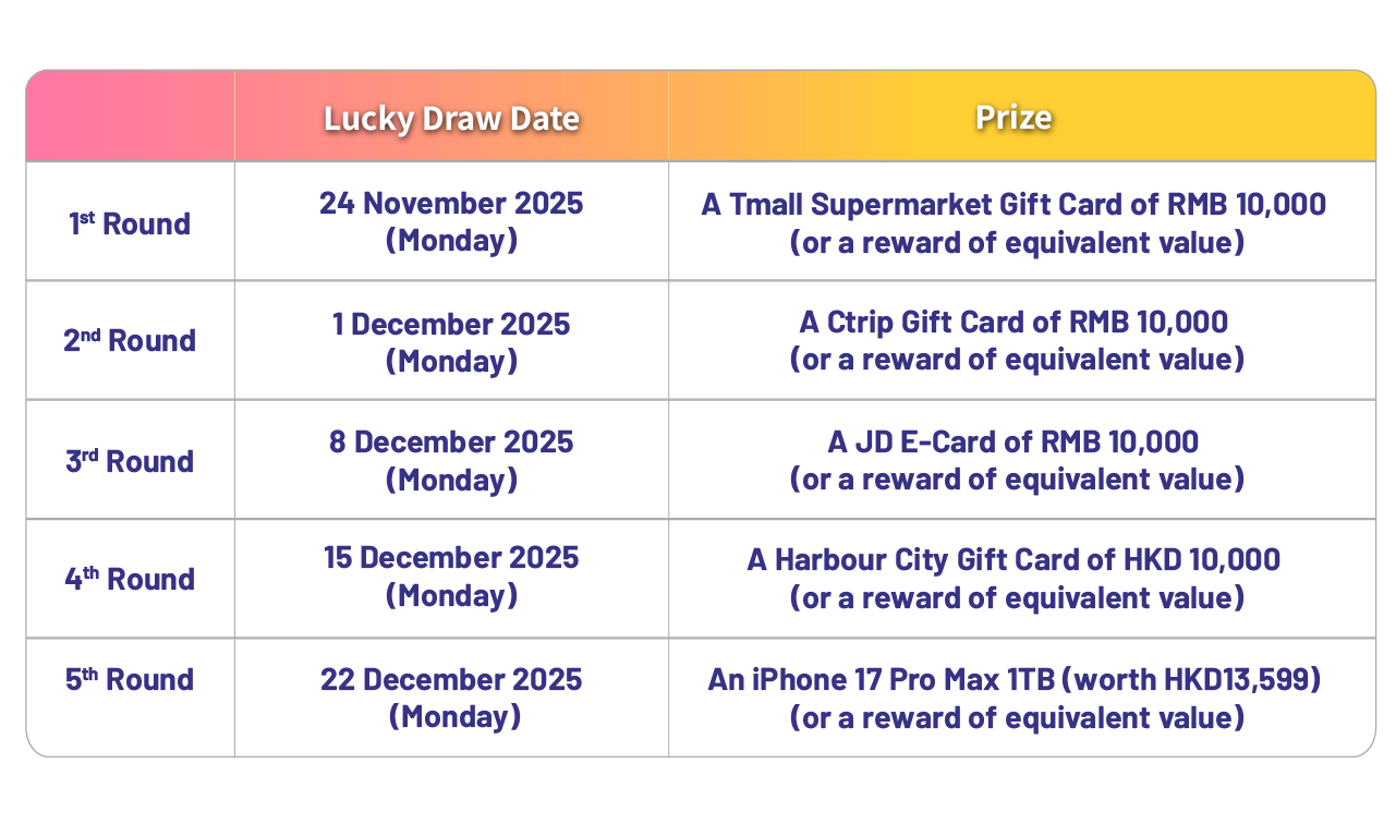 The Promotion Period of the first round is from 17 November 2025 to 23 November 2025 at 23:59 (Hong Kong time) (both dates inclusive).
