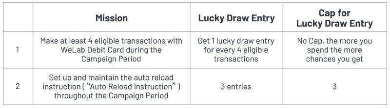 [4] Customers who complete any of the missions set out below within Campaign Period will automatically participate in the lucky draw: