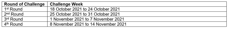 [3] There will be 4 rounds (“Round(s)”) of Challenge Week, and each round runs for 7 days (“Challenge Week”) as below. We reserved the right to change the Challenge Week at any time at our absolute discretion.