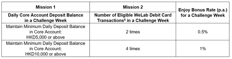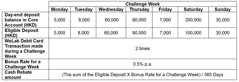 (a) During a Challenge Week, if you maintain a daily deposit balance of HKD5,000 in your Core Account and you conducted 2 Eligible WeLab Debit Card Transactions within that Challenge Week, your Core Account deposit balance holding with us (up to HKD100,000) during that Challenge Week will be entitled to 0.5% p.a. bonus rate.