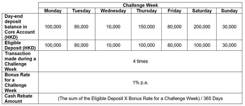 (b) During a Challenge Week, if you maintain a daily deposit balance of HKD10,000 in your Core Account and you conducted 4 Eligible Transactions within that Challenge Week, your Core Account deposit balance holding with us (up to HKD100,000) during that Challenge Week will be entitled to 1% p.a. bonus rate.