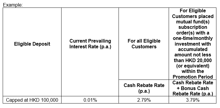 (c) If you have successfully placed mutual fund(s) subscription order(s) with an one-time investment and/or monthly investment with accumulated amount of not less than HKD 20,000 (or equivalent) with your investment account within the Promotion Period, on top of the Cash Rebate Rate, you can enjoy an additional 1% as Bonus Cash Rebate Rate.