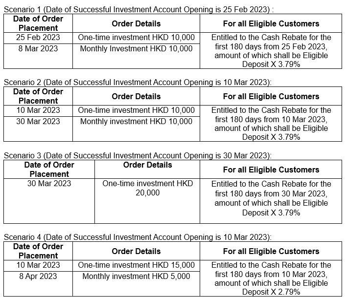[8] The Cash Rebate will be credited into your Core Account within 15 working days after each calendar month from the Date of Successful Investment Account Opening, except for the Cash Rebate for the period from 20 February 2023 to 28 February 2023, which will be credited into your Core Account within 15 working days after 31 March 2023.