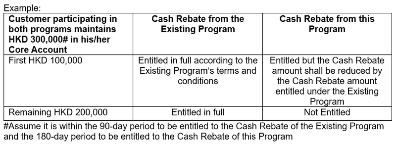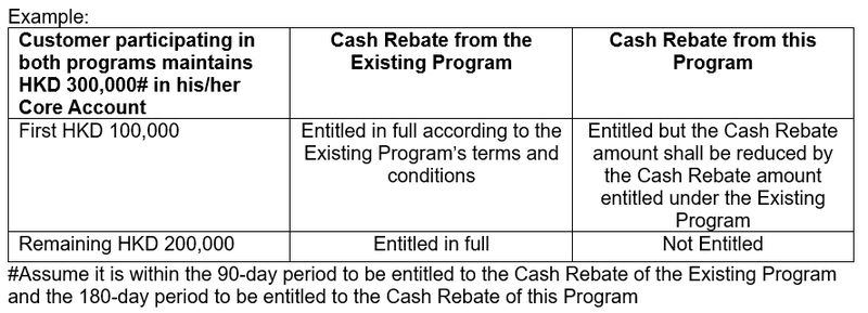 [15] This Program can be used in conjunction with the WeLab Bank Special Savings Interest Rate Program (the “Existing Program”). If any New Customer Eligible Deposit under the Existing Program falls within the definition of Eligible Deposit hereof and therefore is entitled to both the Cash Rebate under the Existing Program and this Program, your Cash Rebate amount under this Program shall be reduced by the Cash Rebate amount entitled from the Existing Program for such deposit.