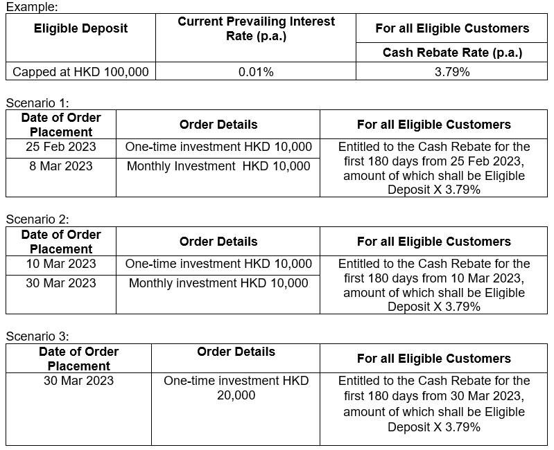 Due to overwhelming response, the GoWealth Auto Upgrade Offer will end at 3pm Hong Kong time on 10 March 2023 (today). You have to successfully place mutual fund(s) subscription order(s) with a one-time investment and/or monthly investment with accumulated amount of not less than HKD 20,000 (or equivalent) with your investment account from 20 February 2023 until 10 March 2023 (today) 3:00 pm Hong Kong time to enjoy an additional 1% as Bonus Cash Rebate Rate on top of the Cash Rebate Rate. (i.e. 3.79% cash rebate rate in total). Eligible Deposit is capped at HKD100,000.