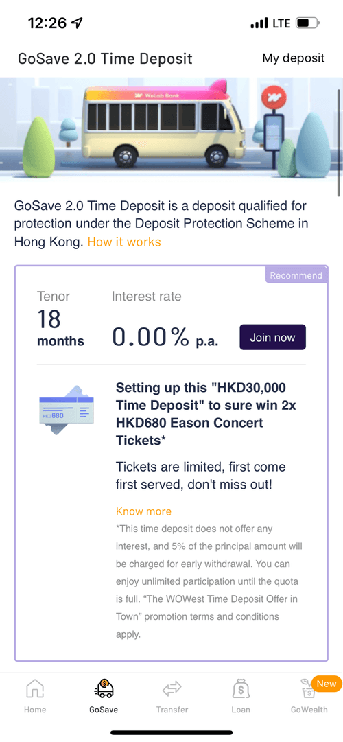 [9] Upon maturity, the Principal Amount and the accrued interest (if any) of the Designated Time Deposit will be transferred to your Core Account. For the avoidance of doubt, the Designated Time Deposit for this Promotion may not provide interest, product details on the GoSave 2.0 product page in WeLab Bank app shall prevail.
