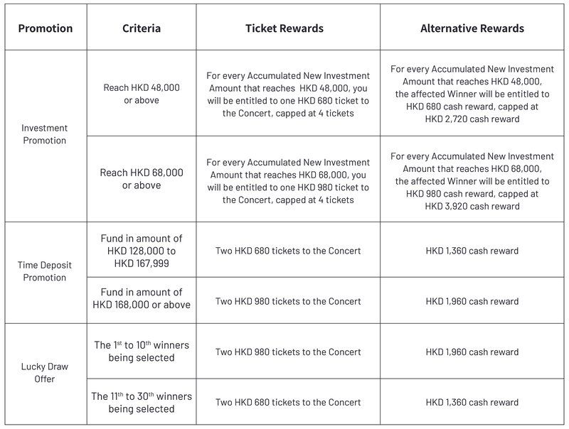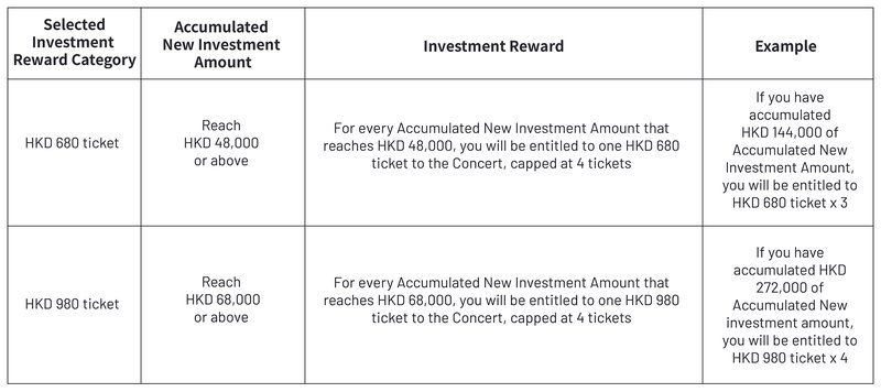 Example 1: Assuming that your Selected Investment Reward Category is HKD 680 and you have made Accumulated New Investment Amount of HKD 96,000. Under the condition that the Investment Reward quota is available, you will be entitled to two HKD 680 tickets to the Concert; however, if the Investment Reward quota is full, you will be entitled to HKD 680 x 2 = HKD 1,360 Investment Mission Cash Reward.