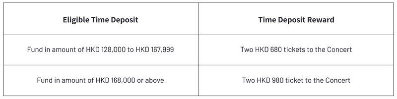[16] You will receive the reward (“Time Deposit Reward”) according to the Eligible Time Deposit placed. You can only set up either one of the below Eligible Time Deposits and will be entitled to the corresponding Time Deposit Reward once only during the Promotion Period. Details are stipulated in below table: