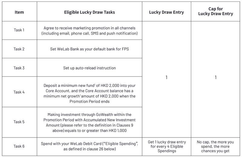 [24] You can get lucky draw entry (“Lucky Draw Entry”) upon completion of one or more Eligible Lucky Draw Task(s). All task completion time will be based on Hong Kong Time (HKT). For details, please refer to below table:
