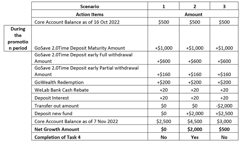 The new fund refers to the net growth of the Core Account balance as of 7 November 2022 as compared with that as of 16 October 2022 after deducting any amount withdrawn from the Core Account during the Promotion Period. The new fund shall exclude funds from Time Deposit maturity, early partial or full withdrawal of Time Deposit, any deposit interest amount and cash rebate amount that is given by the Bank, and redemption amount of mutual fund investment.