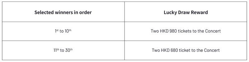 [36] The show date(s) and seat(s) of the Ticket Reward will be distributed randomly. Winners are not allowed to selected specific show date(s) and seat(s), and we do not guarantee adjacent seats will be provided. No exchange will be allowed for dates, seats and ticket price category of the concert ticket.