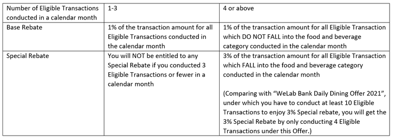 [5] This Offer is the special offer of the “WeLab Bank Daily Dining Offer 2021”, thus this Offer cannot be used in conjunction with the “WeLab Bank Daily Dining Offer 2021”.
