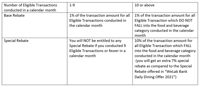 (i) 7 Eligible Transactions which fall into the food and beverage category will be entitled to 10% Special Rebate (extra 7% special rebate compared to “WeLab Bank Daily Dining Offer 2021”) ; and