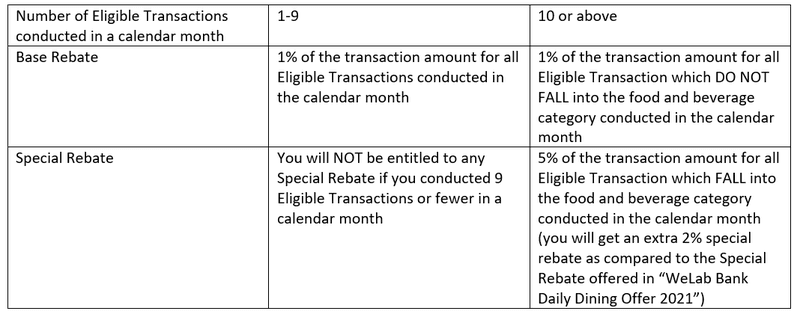 (i) 7 Eligible Transactions which fall into the food and beverage category will be entitled to 5% Special Rebate (extra 2% special rebate compared to “WeLab Bank Daily Dining Offer 2021”); and