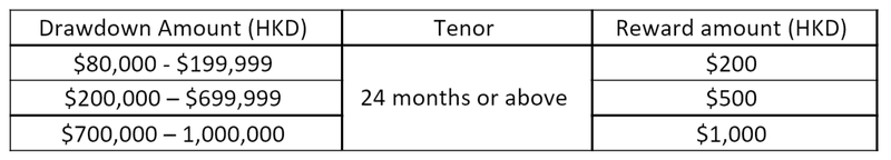 [3] New customers who have successfully applied for GoFlexi Personal Instalment Loan (“Loan”) in accordance with the GoFlexi Personal Instalment Loan Terms and Conditions within the Offer Period at WeLab Bank and draws down the Loan within 7 days after approval with a minimum drawdown amount of HKD 80,000 and a minimum tenor of 24 months can enjoy up to HKD 1,000 account opening and loan drawdown reward (“Reward”). Details of the eligibility for the Cash Rebate are set out in the table below: