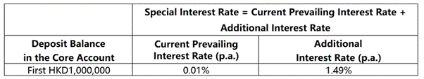 [4] New Customers will be entitled to a special interest rate of a total of 1.5% p.a. (“Special Interest Rate”) for the first 90 days from the Date of Successful Account Opening for eligible deposits placed in the Core Account.