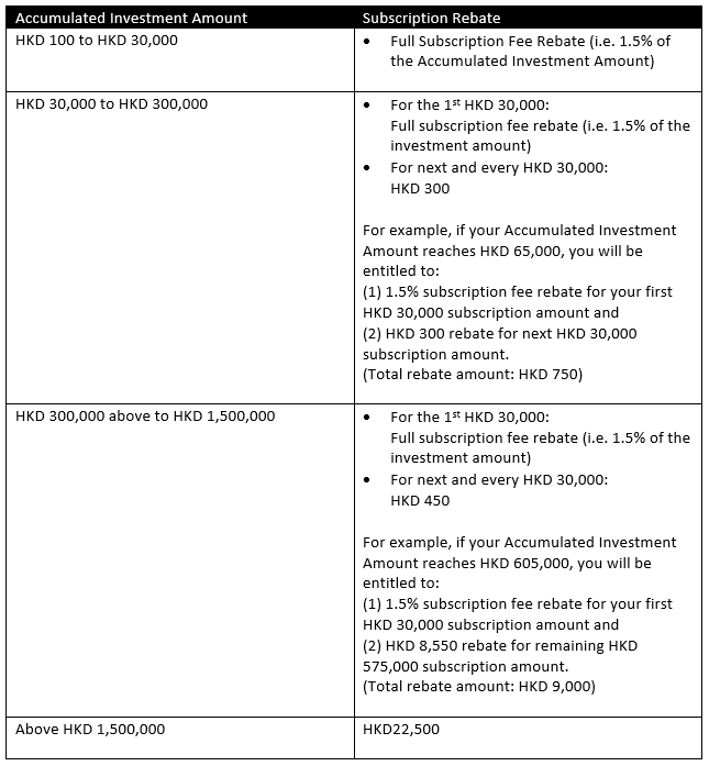 [4] Subject to Clause 5 below, the amount of the Subscription Rebate entitled to you depends on the accumulated investment amount of your Eligible Transaction (“Accumulated Investment Amount”) according to the following table: