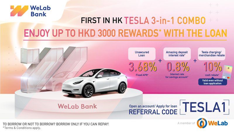 WeLab Bank launches TESLA 3-in-1 Combo, covering 10% cash rebate for Supercharge and TESLA online shops, unsecured car loan at fixed APR of 3.68% and a savings account interest rate of 0.8% p.a.