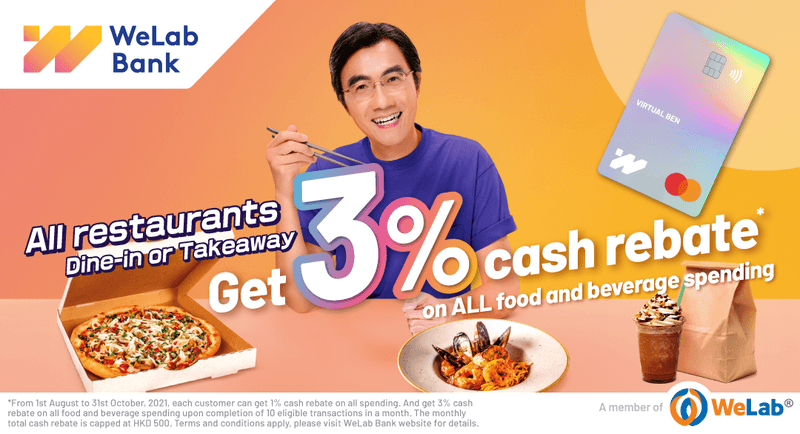 30 July 2021, Hong Kong - WeLab Bank, a virtual bank in Hong Kong, today announced a new spending rebate campaign. From 1 August to 31 October, customers enjoy 1% cash rebate on all spending with WeLab Debit Card. Customers completing the required number of transactions in a month will be entitled to a 3% cash rebate* on all food and beverage transactions! The offer covers all weekdays and weekends, applicable for dine-in, takeaways and food deliveries in all restaurants, enabling customers to “enjoy every day, reward every meal”!
