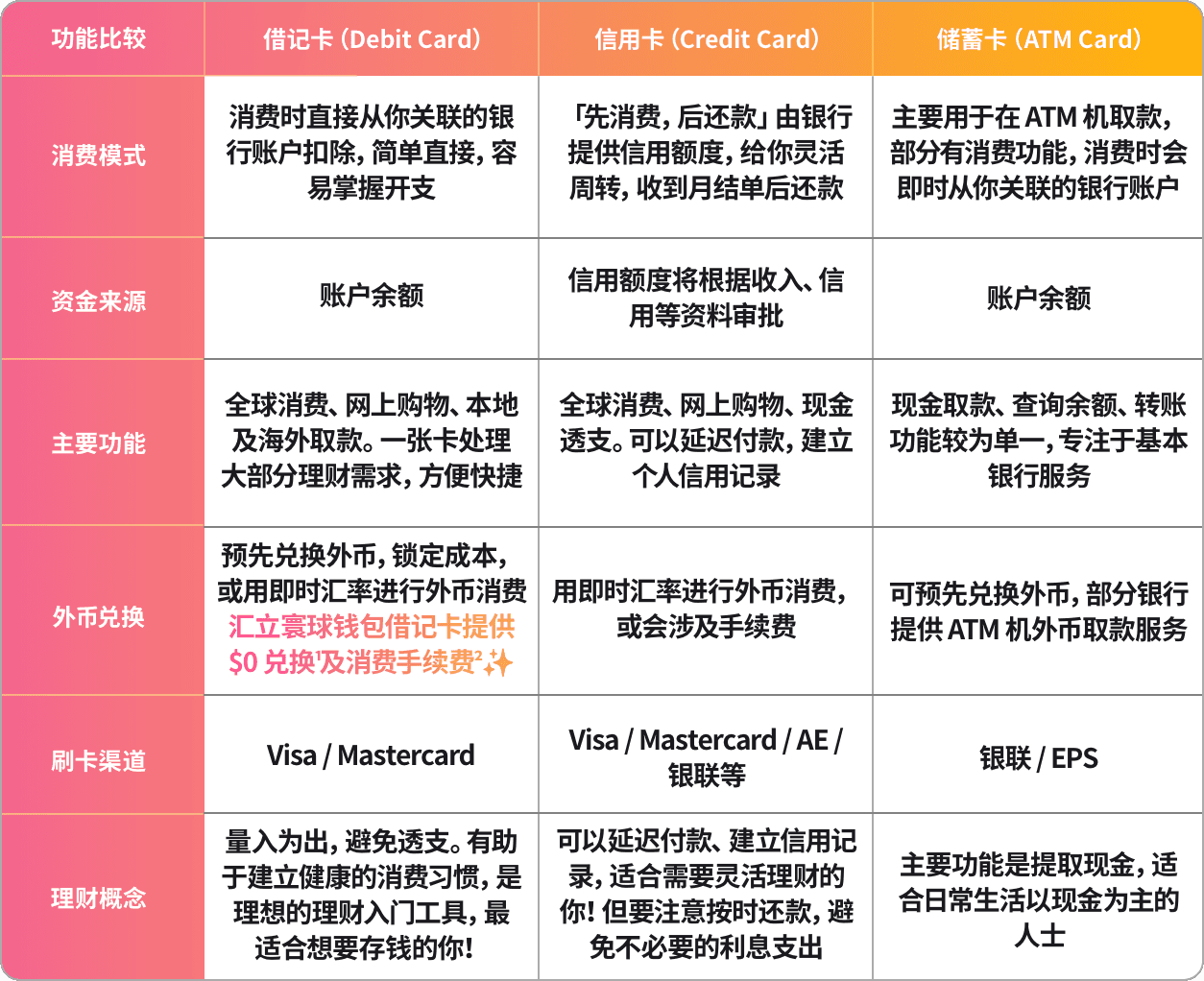 如果搞不清楚这几种卡的区别,又或者想更明智地管理个人财务,这篇新手指南就是为你准备的。我们将一次性为你梳理清楚它们的功能和主要区别,帮你选到最适合自己的卡!