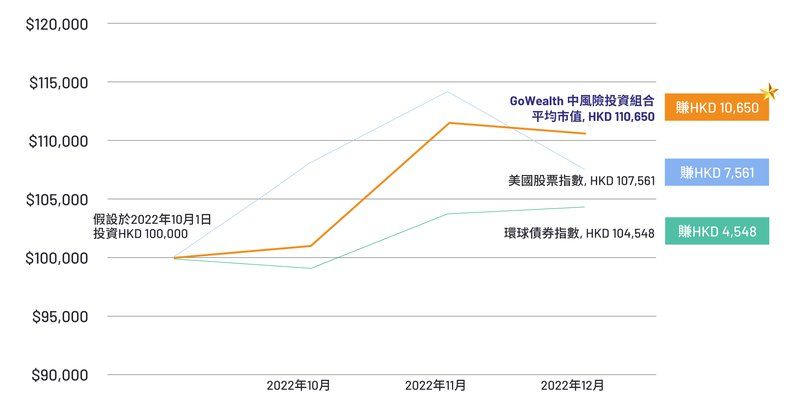 上述數字分別為 GoWealth 屬低風險、低中風險及中風險的投資組合之平均回報,並根據由2022年10月1日至12月31日以美元計算的相關投資組合中的成份基金的資產淨值對資產淨值(NAV-to-NAV) 計算。 過往業績並不代表將來表現,相關資料僅供說明用途。