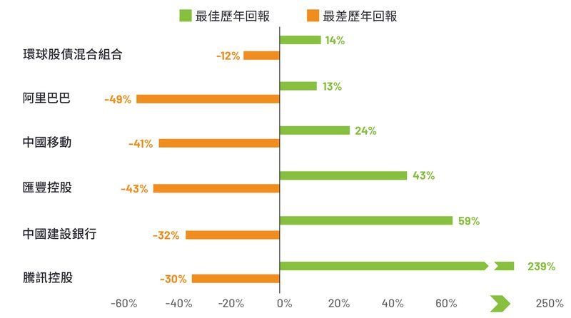 睇返數據,對比現時香港市值最大嘅5隻股票,好容易見到投資喺環球股票同債券嘅投資組合近15年有較穩定嘅回報,價格波動明顯較低1。