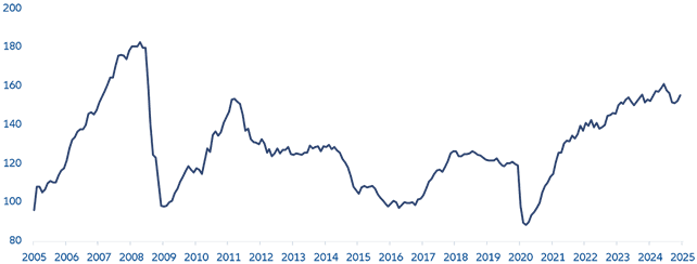 特朗普总统推出严厉的关税政策导致欧洲股市脱轨,欧洲股市已有大约两年半没有录得双位数的跌幅 —在近期调整之前,MSCI欧洲指数自2022年9月以来的总回报为55%。 MSCI欧洲指数自今年3月初的高位下跌17%,随后在4月9日特朗普总统改变关税政策后反弹5%,自美国大选以来,MSCI欧洲指数和标普500指数的跌幅均超过升幅。 最初对商业友好政策的期待逐渐被日益加剧的不 确定性和对关税、解雇公务员以及大规模驱逐非法移民 等措施对增长和通胀影响的忧虑所取代。
