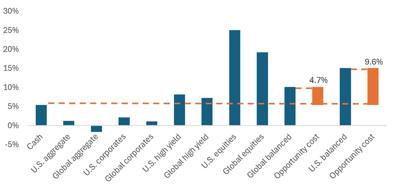 即便在2023年及2024年,许多投资者仍对2022年股市与固定收益的双重亏损记忆犹新。该经历加上联储局加息后现金最终提供不俗收益的事实,促使不少投资者选择转持观望态度。鉴于在经历十多年接近零利率的环境后,储蓄账户、货币市场及存款证提供相对具吸引力的收益率,同时附带的风险极低,部分投资者认为采取避险策略不会造成过多损失。