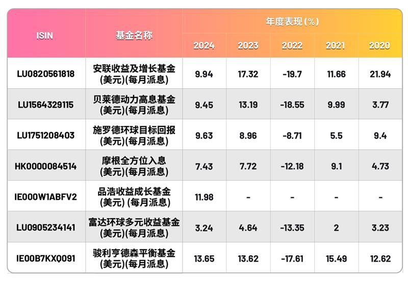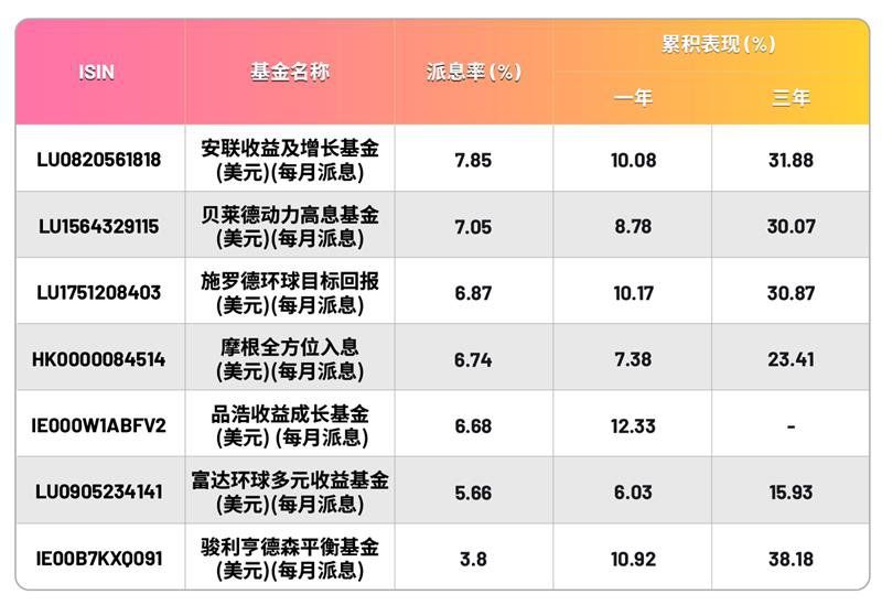 *「派息之选」基金主题”以一年回报表现排序,列出WeLab Bank所代理之所有「派息之选」基金主题(美元股份类別),ISIN、基金回报表现等资料由 Morningstar Asia Limited所提供,资料截至2025年8月31日。我们不会对资料的准确性负责或认可。投资涉及风险。过往表现并非将来指标。资料仅供一般参考,不构成任何招揽、推荐或建议。